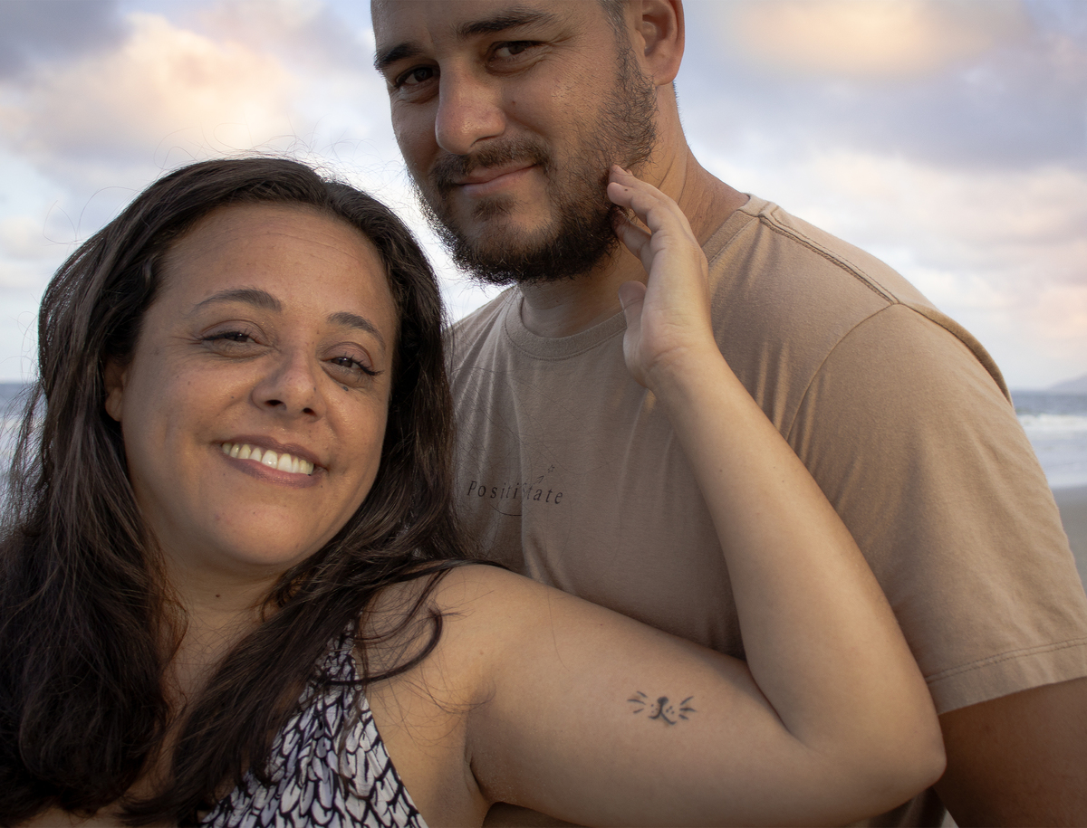 Companheiros de todos os momentos há oito anos,olhares apaixonados como se tivessem conhecido ontem.Seguem construindo uma vida a dois ,apaixonados por bichos com direito a tatuagem e tudo ,do focinho do pet deles que fizeram questão que participasse da foto.