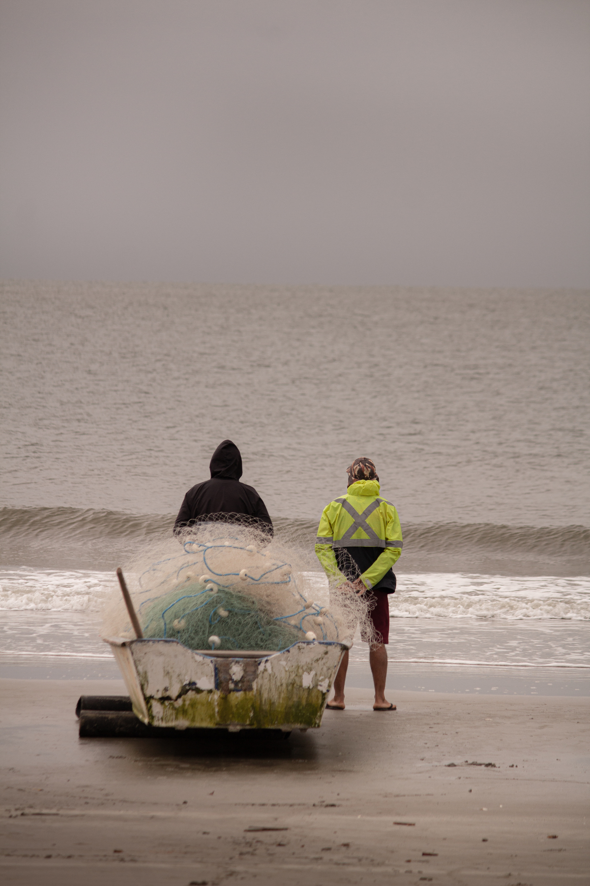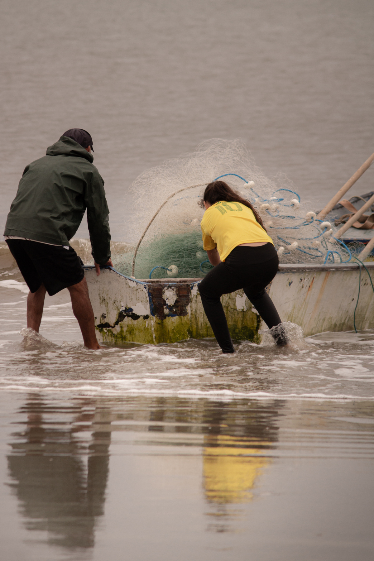 Familias reunidas ,o trabalho em equipe começa. Tem os olheiros em varios pontos da praia,as canoas preparadas para sair assim que o aviso é dado, dentro dela vão ,os que remam, os que soltam as redes,na areia os que puxam as redes, de todas as idades,homens,mulheres ,crianças e até mesmo o que passam.Pois quando a rede vem cheia,fica muito pesada.